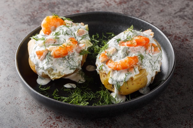 - Pentru sos, amestecă iaurtul cu mărarul fin tocat, sare și piper. Când cartofii s-au copt, acoperă-i cu sos și consumă-i împreună cu creveții.