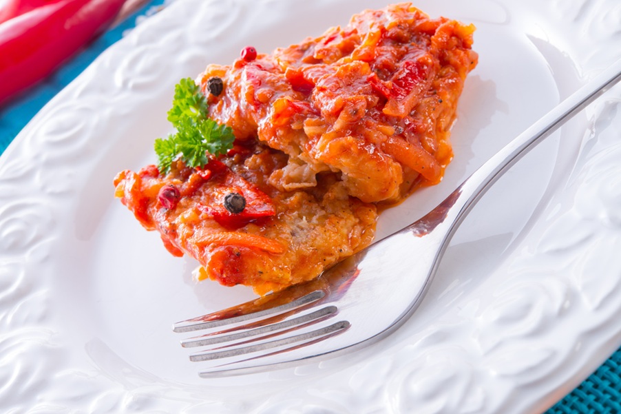 Rețetă sănătoasă, permisă în boli cardiovasculare și diabet. 1 porție conține 385 kcal, 60 g proteine, 10 g lipide și 10 g glucide. 100 grame de mămăliguță adaugă porției tale 70 kcal și 15 g glucide. Ingredientele sunt pentru 5 porții. Timp de preparare: 1 oră și 10 minute