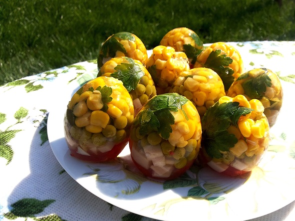 - Introduci vasul în frigider pentru 2-3 ore. Înainte de a servi coronița, o răstorni pe un platou și o decorezi cu rondele de ardei iute, maioneză, pătrunjel.
