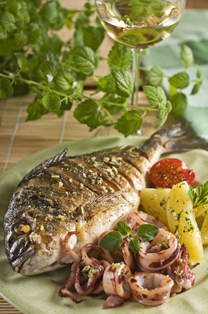 3. Separat, curăţă peştele, condimentează-l cu sare şi piper și umple-l cu calamarii rumeniţi. Prinde cu scobitori şi aşază-l într-o tavă unsă cu ulei. Stropeşte-l cu puţină marinată şi vin, crestează-l şi lasă-l la cuptor aproximativ 40-45 de minute.