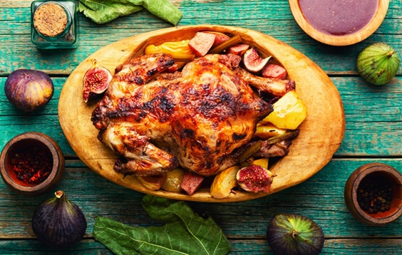 - Așezi într-o tavă carnea și fructele. Le stropești cu siropul rămas de la fierberea fructelor și introduci tava în cuptor, la foc mediu, pentru aproximativ 30 de minute. Servești carnea de pasăre în sos de fructe, cu garnitură de pere, smochine și prune, alături de o salată de sezon (de varză, murături etc.).