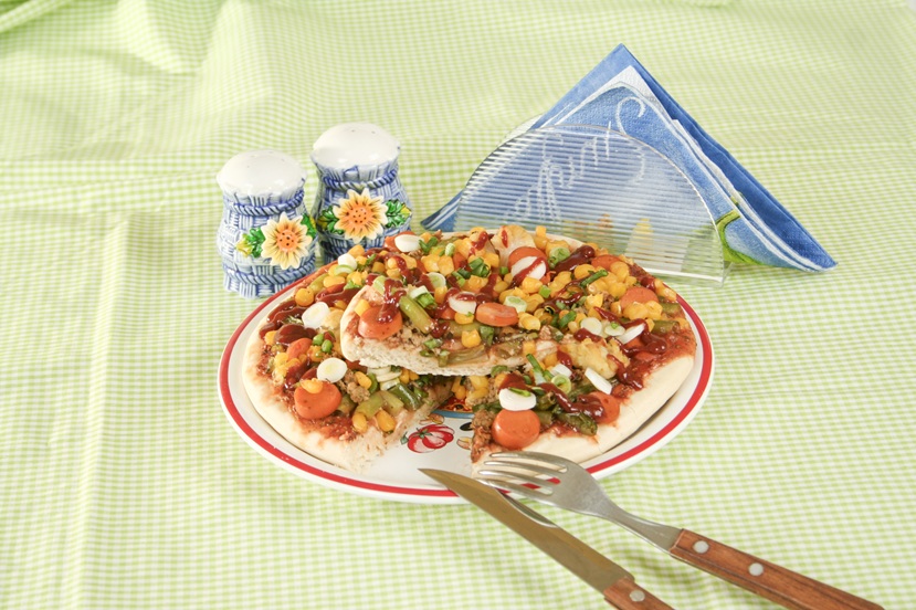 3. Pe planșeta presărată cu făină, întinzi aluatul într-o foaie cu grosimea de 1 cm, pe care o așezi într-o tavă de aragaz unsă cu margarină și tapetată cu făină sau în două forme rotunde de tartă. 4. Înțepi aluatul din loc în loc cu o furculiță, torni pasta de tomate diluată cu apă, repartizezi legumele și crenvurștii și dai pizza la cuptor, la foc mijlociu, pentru 30 de minute.